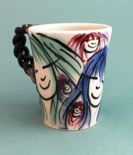 A cheerful array of blissful faces in blue, green, purple and burgundy with custom braided clay handle in our house black glaze. Standing 4-3/4” tall, these mugs will hold 10 oz.+ of your favorite beverage. |